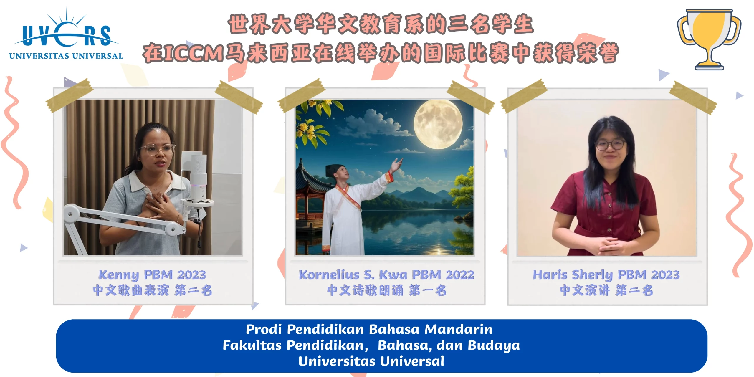 2025年09月01日,ICCM马来西亚在线举办了国际比赛—— Chinese Global Competition。来自世界大学华文教育系的三名同学在不同项目中展现了自己的才华,2022级Kornelius Setya Kwa(柯志宏)在中文诗歌朗诵比赛中荣获第一名;2023级Kenny(黄静怡)在中文歌曲表演比赛中获得第二名;2023级Haris Sherly(蓝怡洁)在中文演讲比赛中获得第二名。 据悉,比赛采取线上形式,参赛选手需提交录制视频,并且经过初赛和决赛两个环节的比拼。本次大赛不仅吸引了众多大学生的积极参与,使竞争格外激烈,也为青年中文学习者提供了一个展示才华与交流切磋的平台。 在中文诗歌朗诵比赛中,Kornelius Setya Kwa(柯志宏)选《水调歌头·明月几时有》(宋·苏轼)作为朗诵题目,而在决赛中带来《将进酒》(唐·李白)。他表示,能参与这次的比赛感到很开心,因为在备赛的过程中,不仅让自己更加深入地理解了古典诗词之美,也提升了对中华文化的热爱与学习热情。 在中文歌曲表演比赛中,Kenny(黄静怡)在初赛中演唱周深的《大鱼》,而在决赛中选了王菲的《如愿》。他表示,在备赛的过程中,他因嗓子不太舒服差点放弃,但仍坚持不懈、反复录制。她也说道:“努力也许不会立刻开花,但终会在某一天结果。只要坚持下去,就能看到属于自己的光。” 在中文演讲比赛中,Haris Sherly(蓝怡洁)演讲了关于他学习汉语的经历,在初赛中他以《走进汉语的世界》为题,而在决赛中他以《汉语中成长》为题。她表示,虽然录制演讲视频需要多次练习和拍摄,但锻炼的过程也提升了自己的心理素质,也让她体会到“千里之行,始于足下”的深刻含义。这段经历不仅让她更加自信,也更加坚定了继续学习汉语的信念。 此次优异成绩的取得,离不开世界大学教师们的悉心培养。三名同学的成绩,不仅展现了世界大学学生扎实的中文能力,也为学校增添了新的光彩。同时,他们也希望以自身的经历激励更多汉语学习者坚持不懈地追求进步。 文字:Angellinne Tan(陈家玉) 编制:Yanti(洪丽萍)